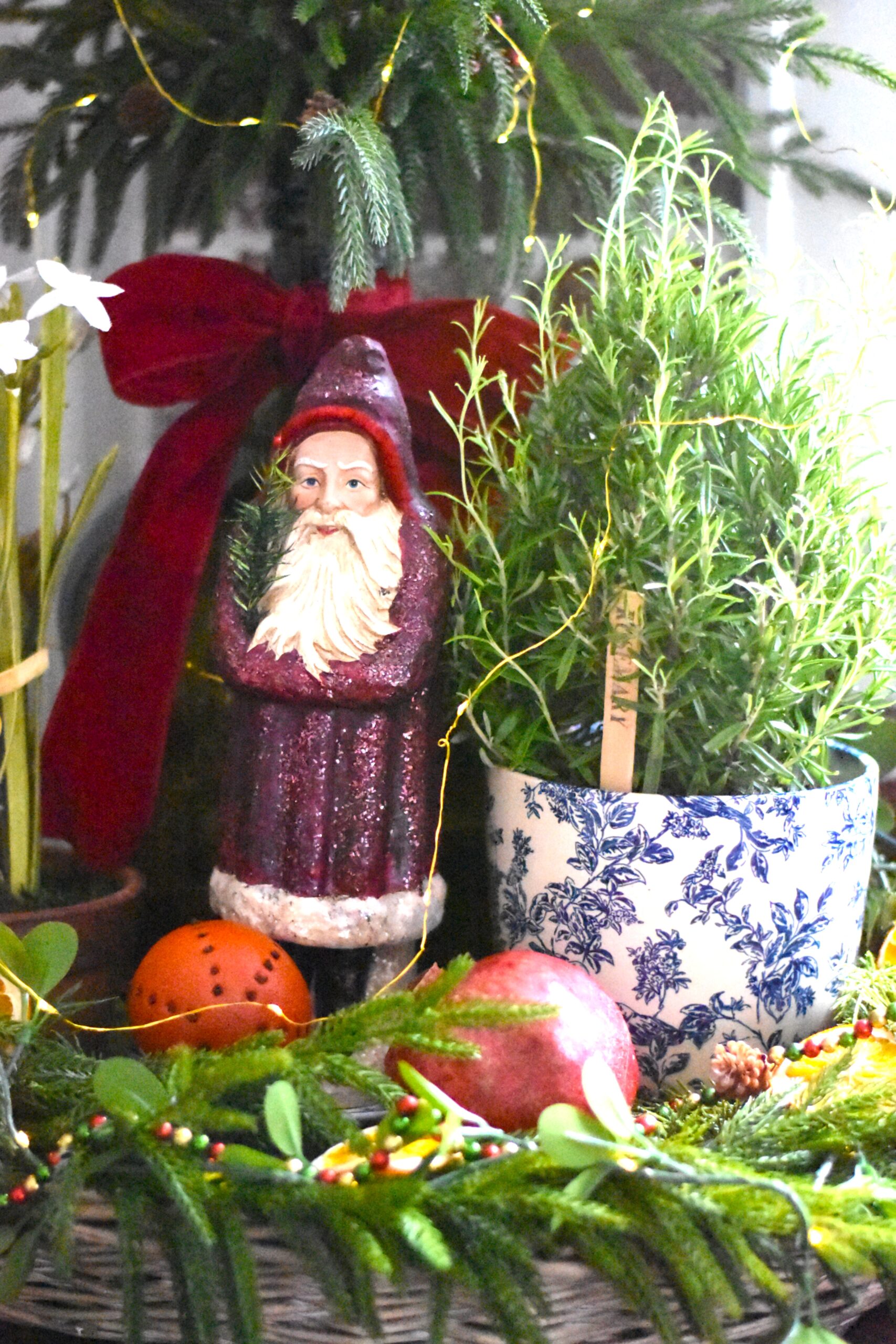 Christmas Kitchen 25 Belsnickle and Bow December 8, 2025 by Amber Lyon Ferguson / Leave a comment Christmas styled basket with burgundy velvet ribbon. Potted Rosemary tree in blue and white pot Share:
