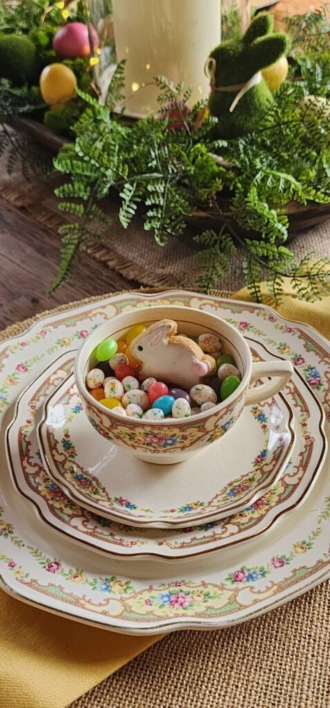 I love these dainty vintage dishes! I think they look so perfect for the season with the colors and tiny flowers design. I filled each tea cup with jelly beans and adorable little bunny cookies that I picked up at Dollar Tree FIVE years ago! My blog readers know I always reuse cheap holiday candy as props. Since the candy never seems to rot or mold, it does make you question what’s in it…