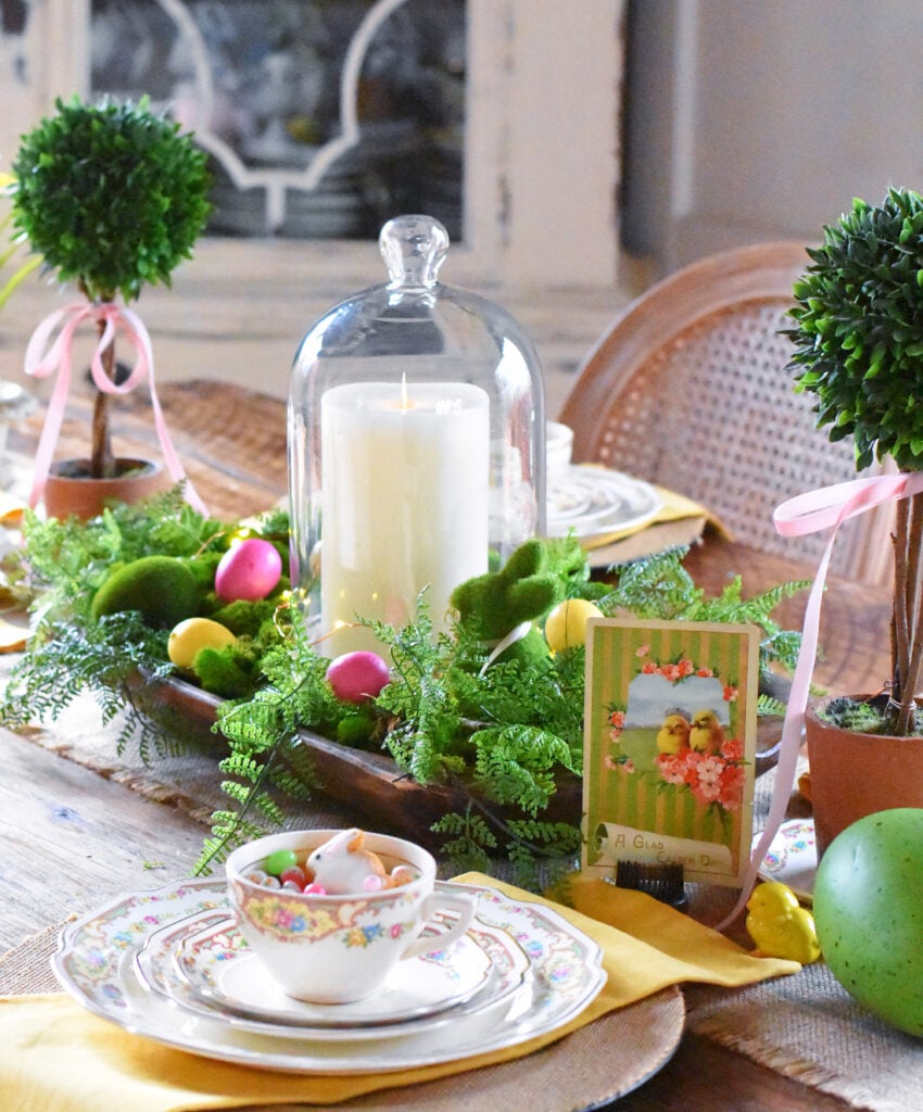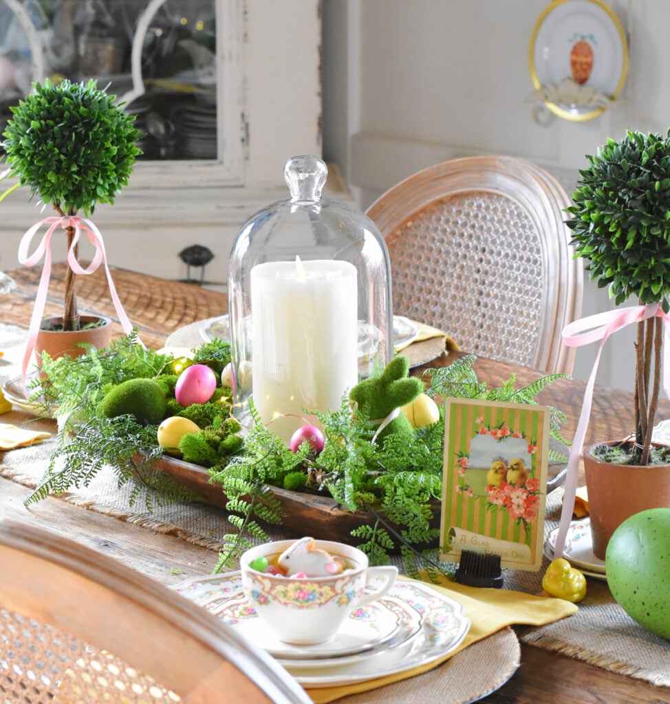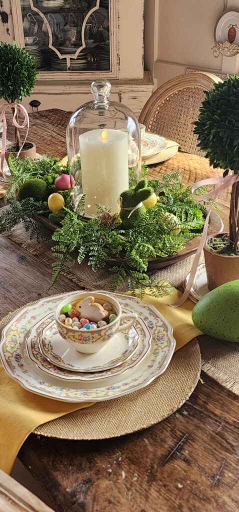 For my centerpiece, I went with my tried and true dough bowl with a candle cloche in the center, along with my boxwood topiaries on each side and tiny chippy urns. If you have been a follower for a while, then you have seen me use these items over and over in new ways. This year I kept the dough bowl display extremely simple by filling it with moss, ferns and eggs or a springy look. The tiny fairy lights to make it extra festive.