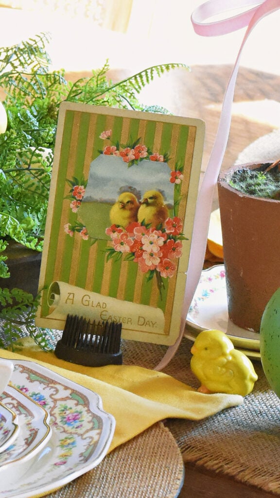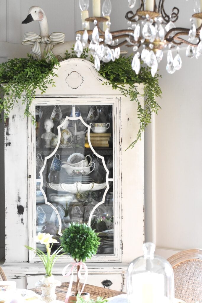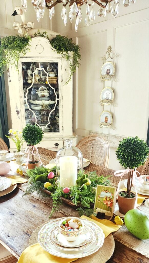 I didn’t use any big bunnies on my Easter table this year, since my big duck on top of the cabinet is the spring animal of focus in the dining room.