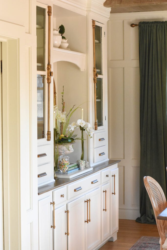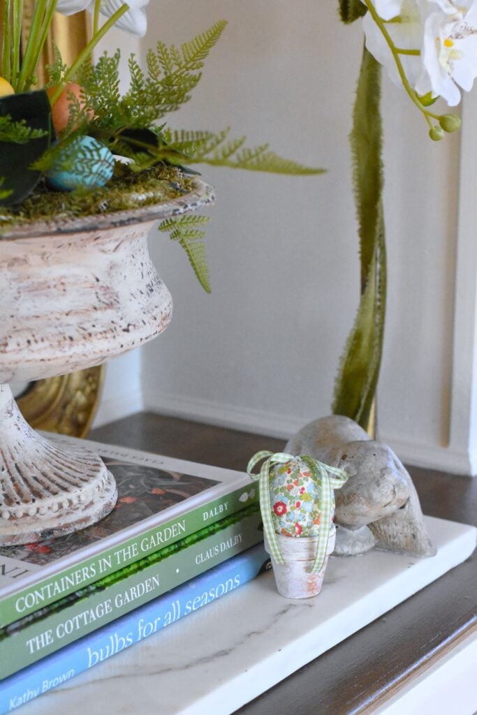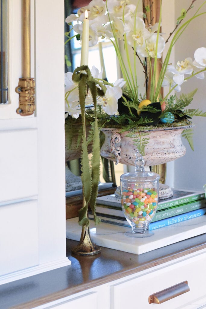 I keep my faux orchids in a French urn in the cubby on the dining room built ins from Spring through fall. I just change some of the accents around it seasonally. I tucked in a few little egg and stacked the urn on top of some favorite gardening books for extra seasonal color and interest.