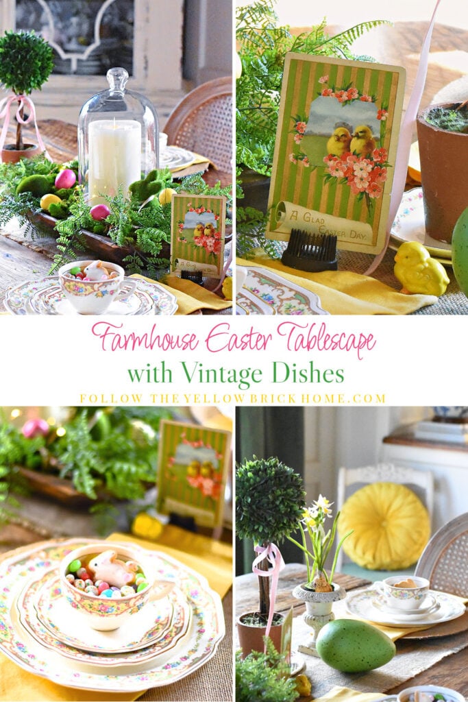 Today I am sharing my Farmhouse Easter tablescape with vintage dishes, and a few views of my spring dining room. You will find links to the other beautiful spring and Easter posts at the end of this post.