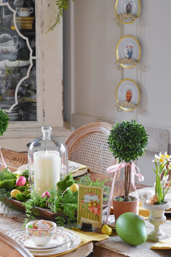 However, there is one little tiny mossy bunny in the dough bowl centerpiece and some tiny bunny cookies in each vintage tea cup. In addition to the vintage dishes on my table, you might notice the three pretty egg plates on my wall plate rack.