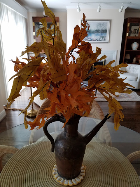 Another means of adding a fall touch is to simply cut a few branches of leaves from a maple tree that’s turning colors. If that’s not feasible, you can purchase preserved stems from craft stores, but my method is much cheaper. 😉