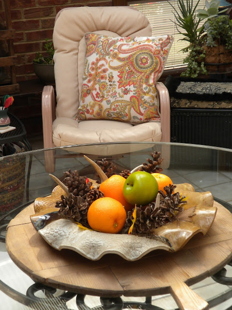 If you live near a forest or woods, it’s very easy to gather things from nature that work especially well in fall decor. Below, I’ve arranged pine cones, deer sheds (given to me by a friend), and faux fruit “picked” from a local estate sale. They’re all contained within a handcrafted birdbath bowl, perched on an antique bread board purchased on one of my many antiquing ventures.
