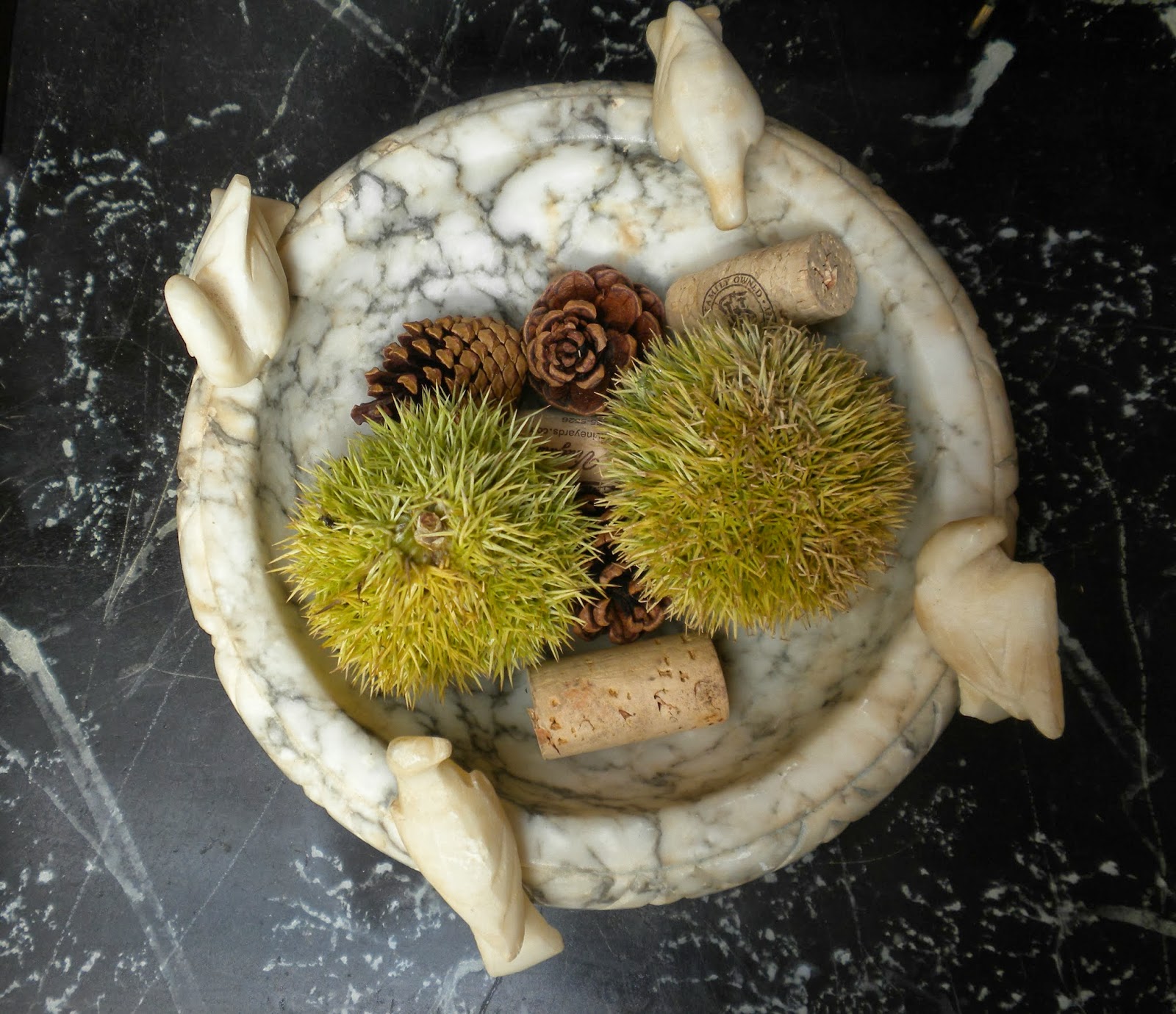 A mini birdbath can be used for indoor tabletop display. Who says you have to put water in the birdbath? Here, a few small pine cones, wine corks, and chestnut pods make a nice fall vignette.