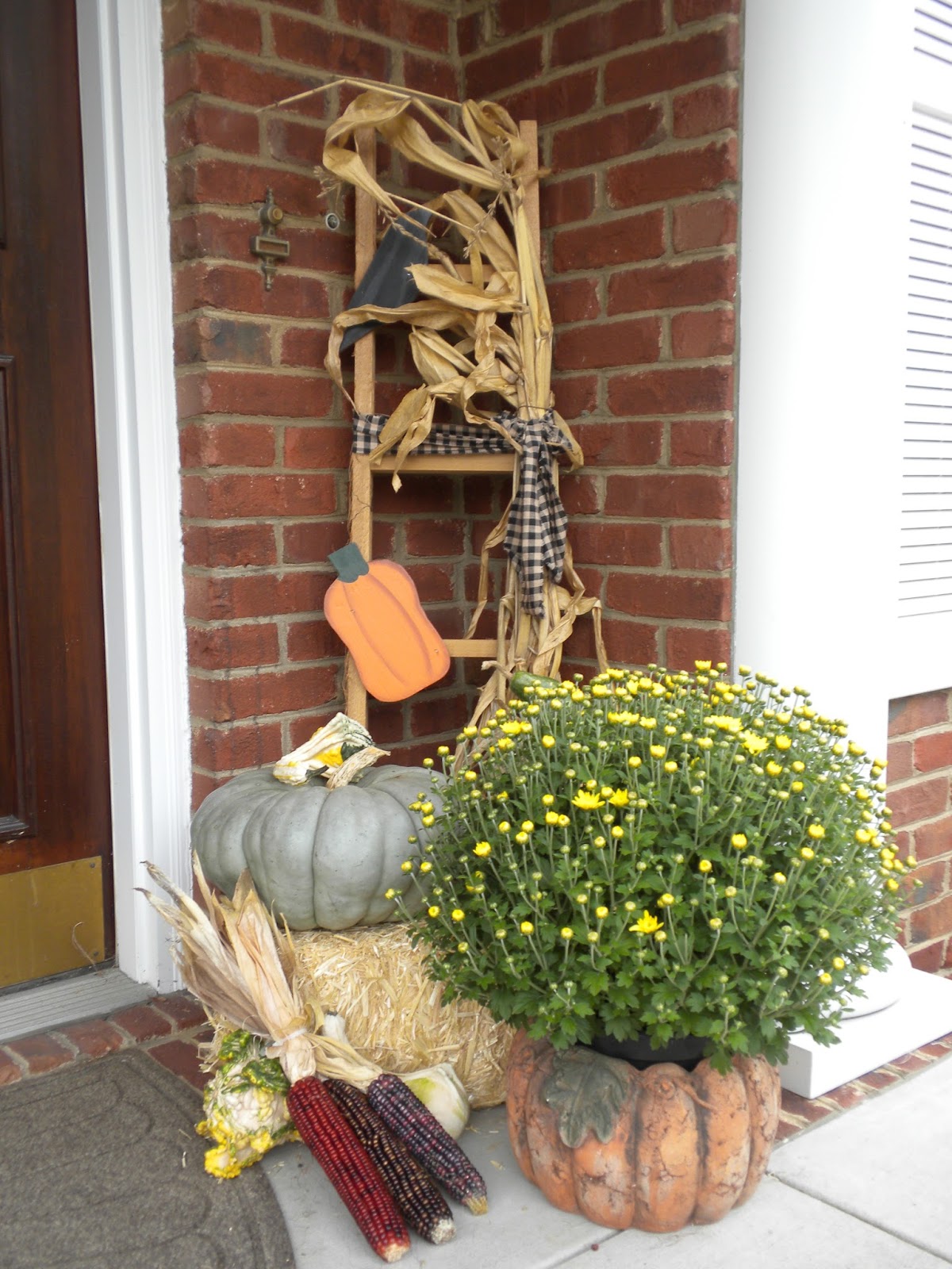 Porch decor varies from year to year, and I like mixing natural garden elements along with vintage things, and, as is the case below, with handcrafted items like the ladder with crow and pumpkin, purchased from a local fall fair. Again, the pumpkins, mums, Indian corn and hay bale came from my local farmers’ market, but most grocers now stock these items seasonally.