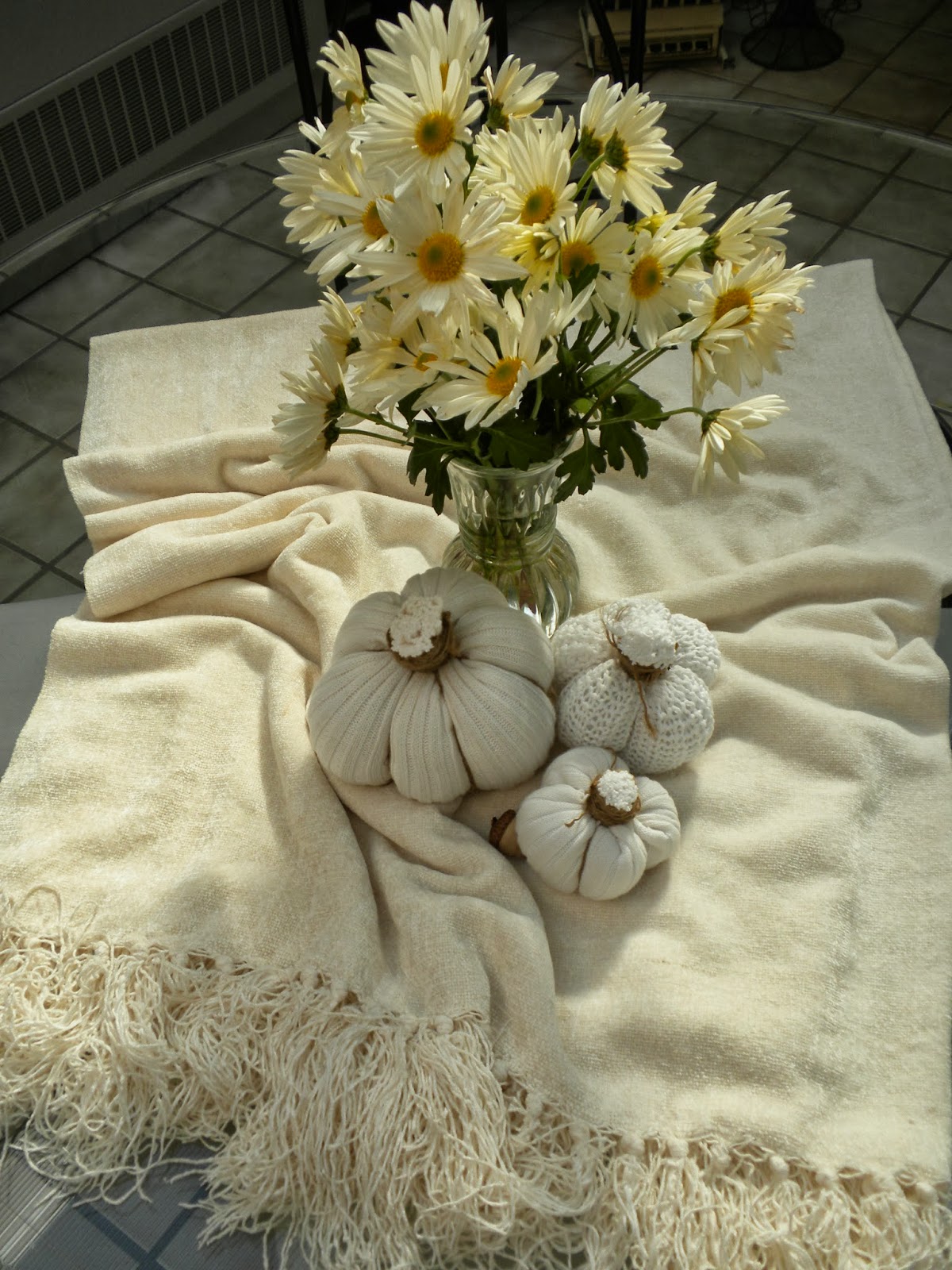 Another way of using the thicker logs of the fallen birch trees, I cut graduated pedestals for use in yet another table centerpiece. Once again, pumpkins, pine cones, gathered acorns and leaves finish the vignette.