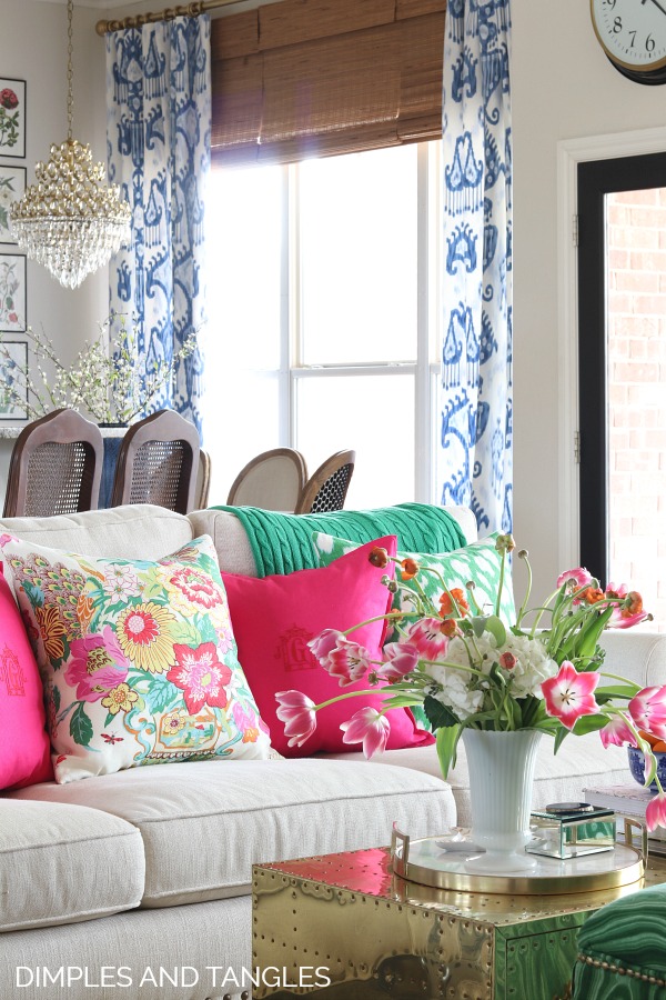 Bolder pink pillows and coordinating floral pillows mimic bright pink tulips and make a colorful spring statement in this beautifully designed space.